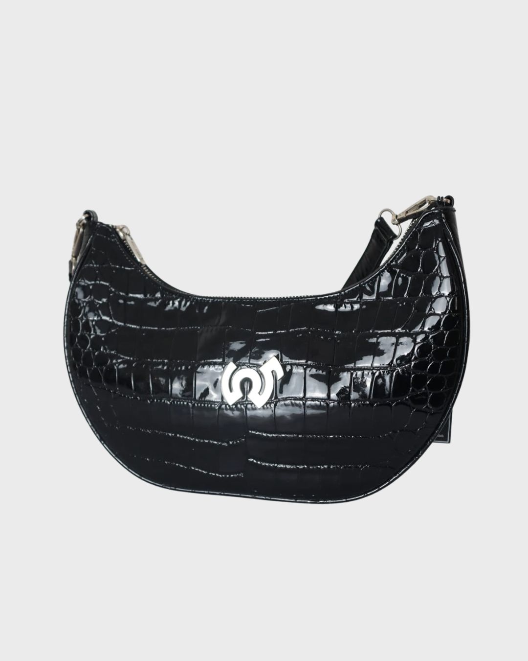Glossy black hobo bag with a modern curve for a polished, standout look.
